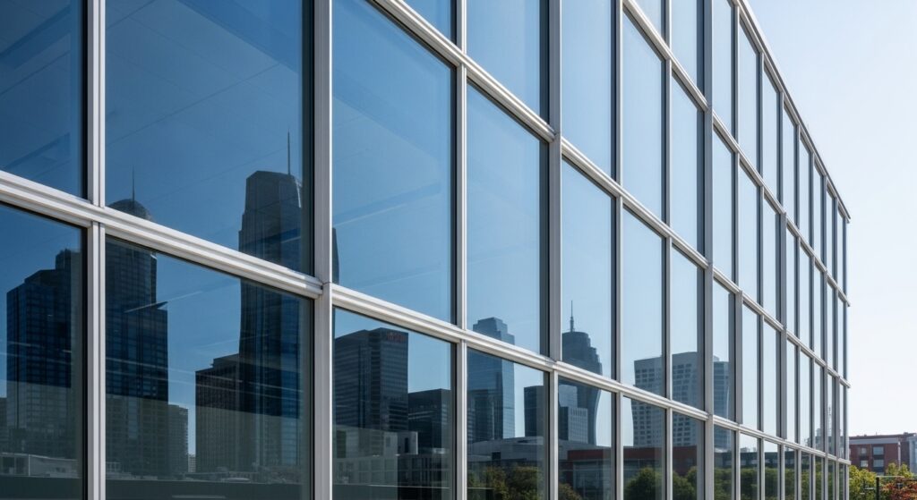 Modern curtain wall systems use double glazing, low-E glass, and thermal breaks to control heat transfer.
